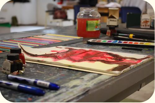 wat voelt het weer lekker om gewoon aan een tafel die vies mag worden te werken met ecoline, houtskool, kleurpotloden, aquarelverf en inkt.
